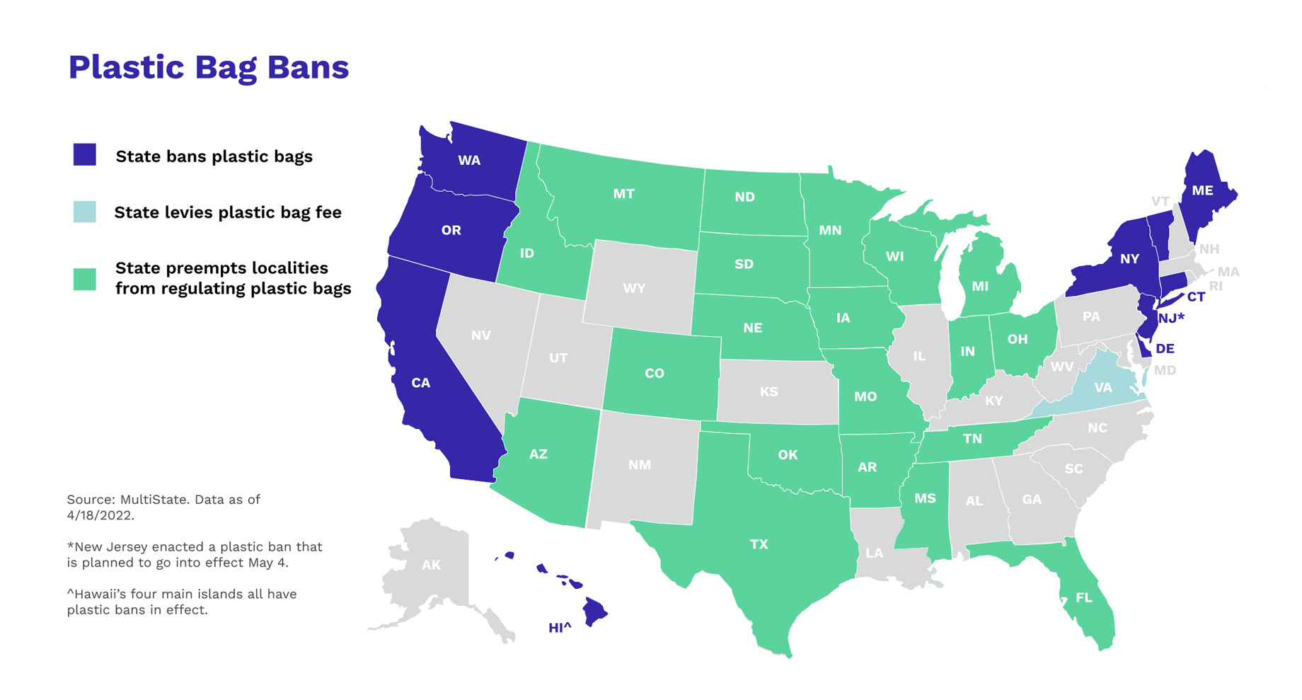 In 2022, at least 40 bills have been introduced in 16 states related to plastic bag bans. These bills fall into distinct categories: