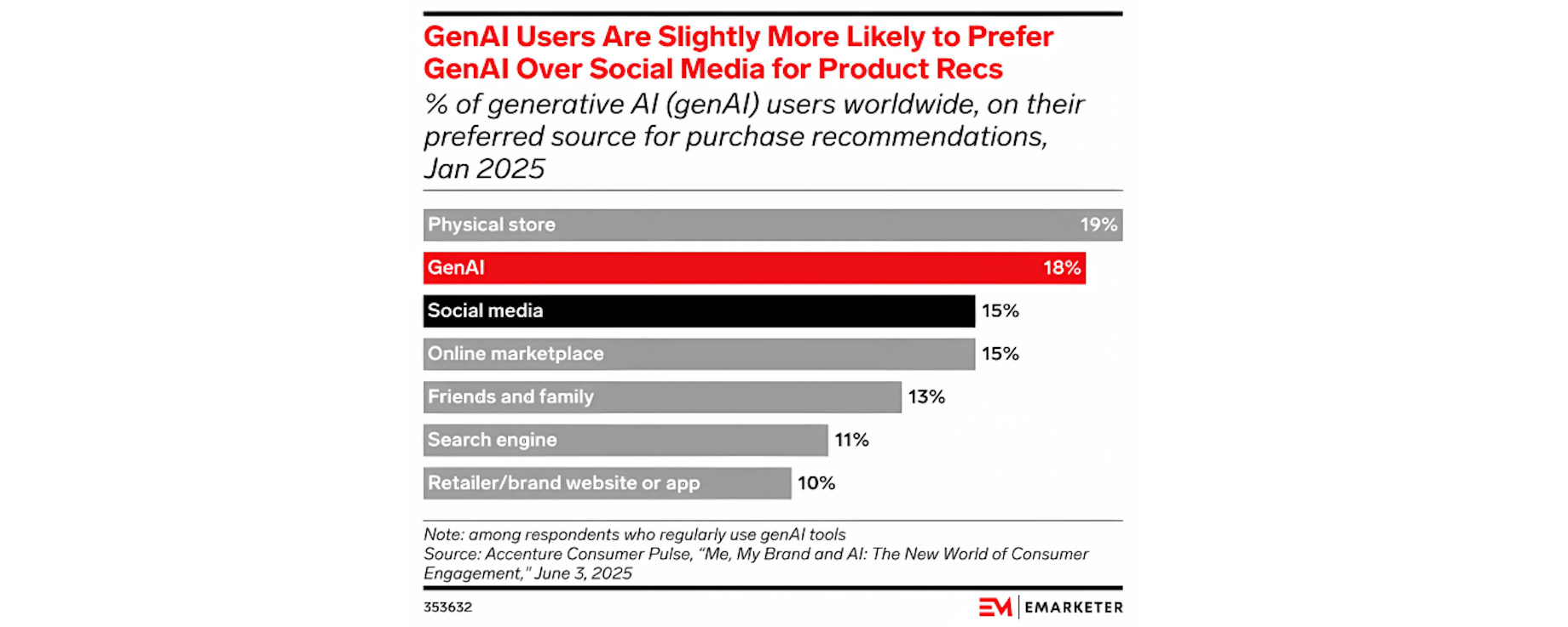 Let’s start with something that should make every shopping center marketer sit up and take notice. A recent Mirakl Ads-sponsored report from Emarketer notes that generative AI users are now slightly more likely to prefer generative AI platforms over social media for purchase recommendations — 18% versus 15% for social media, according to data from Accenture Consumer Pulse. Physical stores still lead at 19%, but here’s what’s fascinating: We’re witnessing a real-time shift in consumer trust patterns.