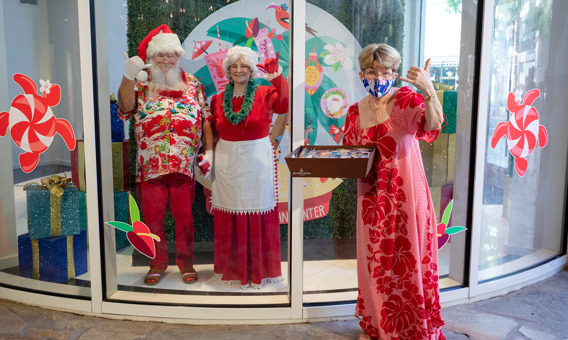 In 2020, Shenkus helped Royal Hawaiian Center adapt to the pandemic with a safe, family-friendly holiday experience. Festivities included a Santa snow globe photo op. “We wanted kids to be able to have some normal type of joy,” she said. Shenkus gave macadamia nut cookies to all the participants. Photo courtesy of Royal Hawaiian Center