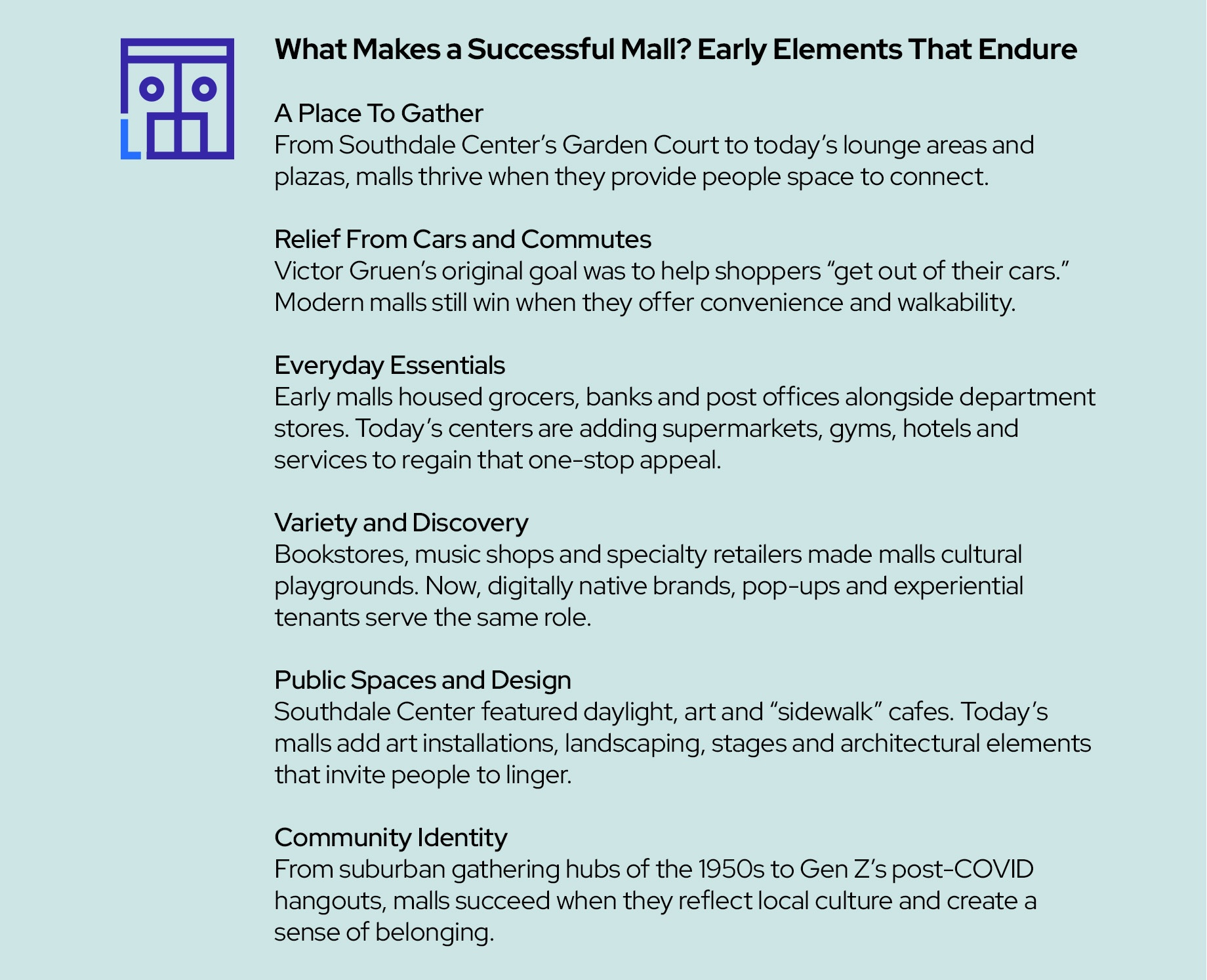 In many ways, malls are reprising roles that go back to their earliest days. After World War II, for example, the then-new centers gave Americans an escape from the isolation of suburban life. Likewise, shoppers in the post-pandemic era have flocked to malls to recapture the social, shopping and dining experiences they missed during COVID lockdowns. That same impulse for gathering together helps explain why Gen Z, in particular, is so keen on malls.