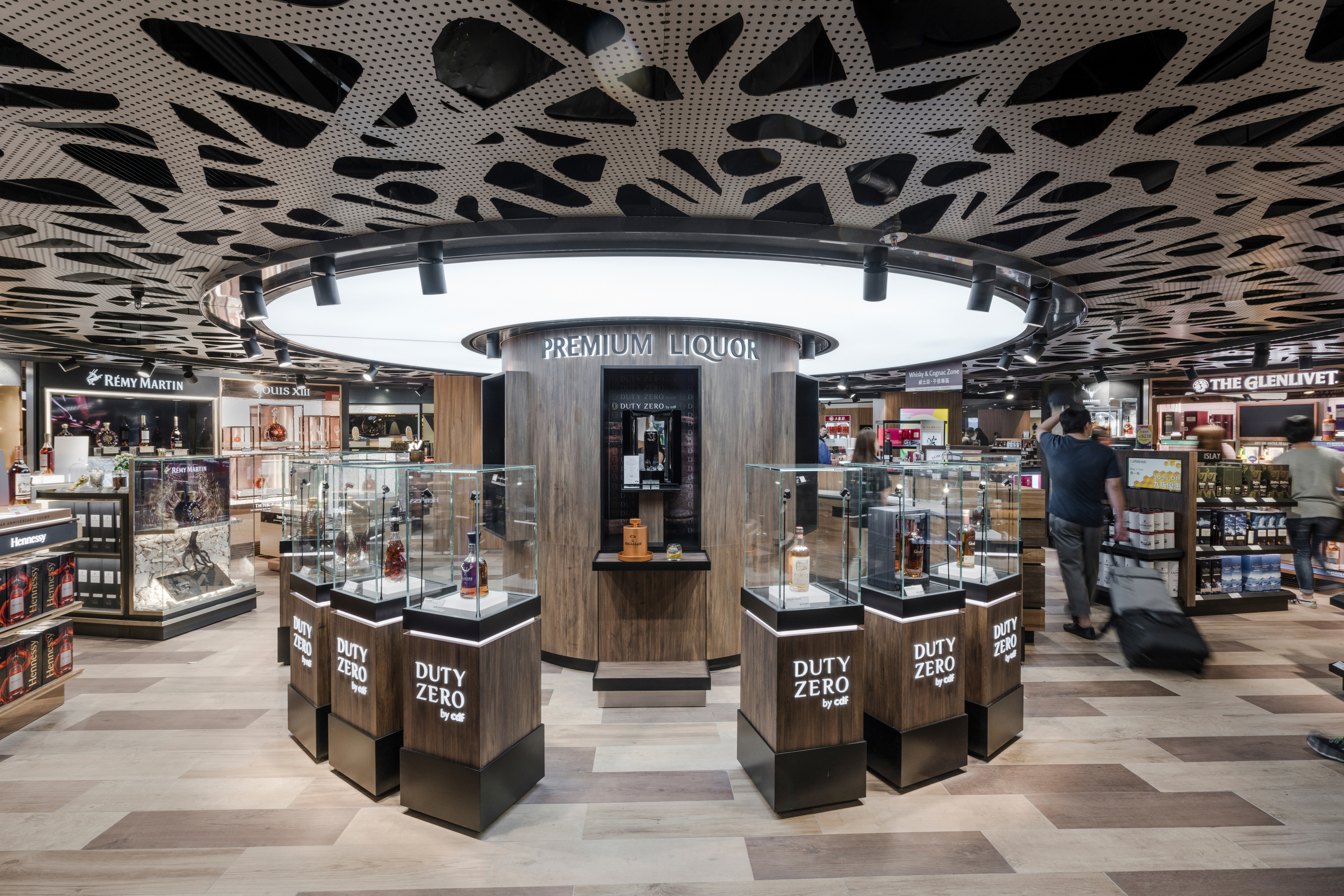 The Duty Zero shop, at Hong Kong International Airport, is a shop-within-a-shop environment that features a digital sommelier, lounges, tasting stations and selections of wine, spirits, tobacco, cigars and specialty merchandise. A distinctive portal gate is fronting the shop.