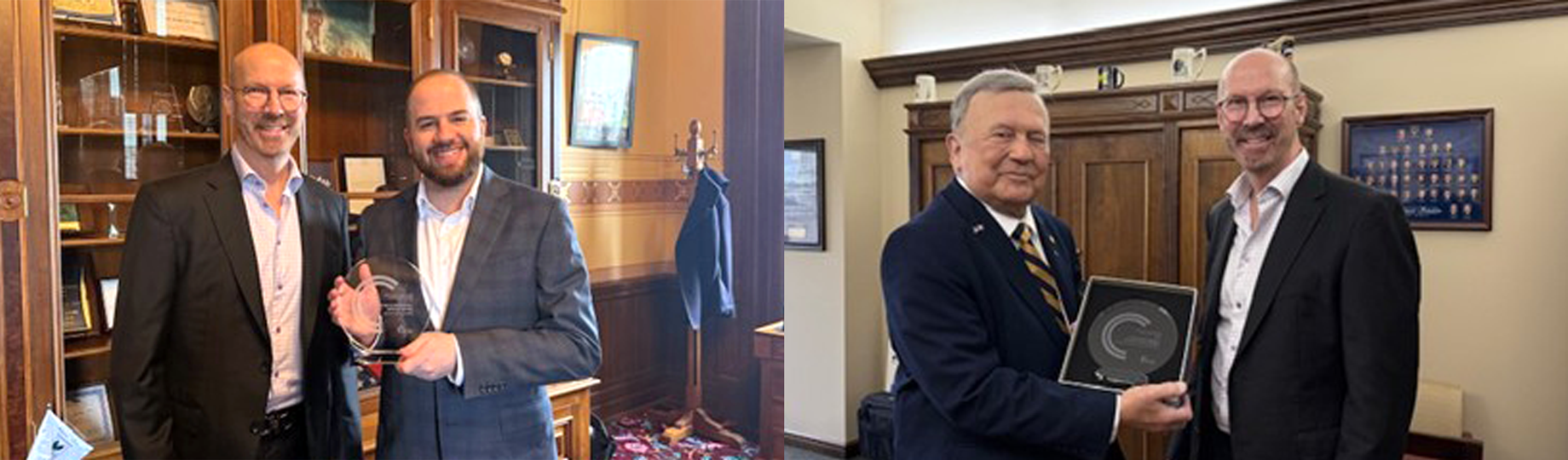 Michigan State Senator Jeremy Moss and Michigan State Representative Douglas Wozniak receive the 2025 State Legislative Excellence Award from Michigan Government Relations Chair Ed Eickhoff.