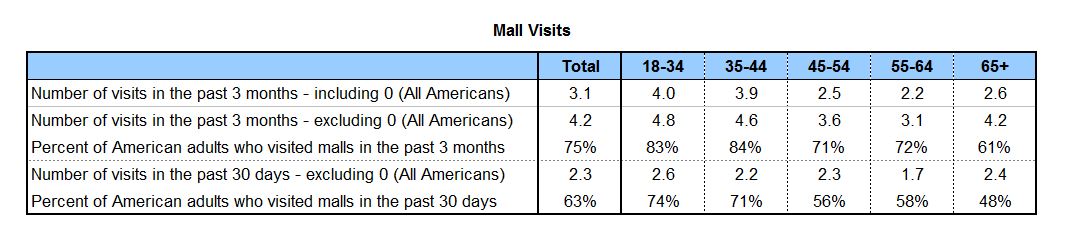 Although the roughly 1,2001 U.S. regional and superregional malls comprise just 1% of all shopping centers in the nation, they attract a significant and loyal following. 75% of adult Americans—approximately 184 million people—went to a regional/superregional mall at least once in the past three months. These mall visitors went 4.2 times during that period, which equates to 3.1 visits for all American adults. In the past 30 days alone, 63% of American adults went to a mall, making on average 2.3 visits during that time.