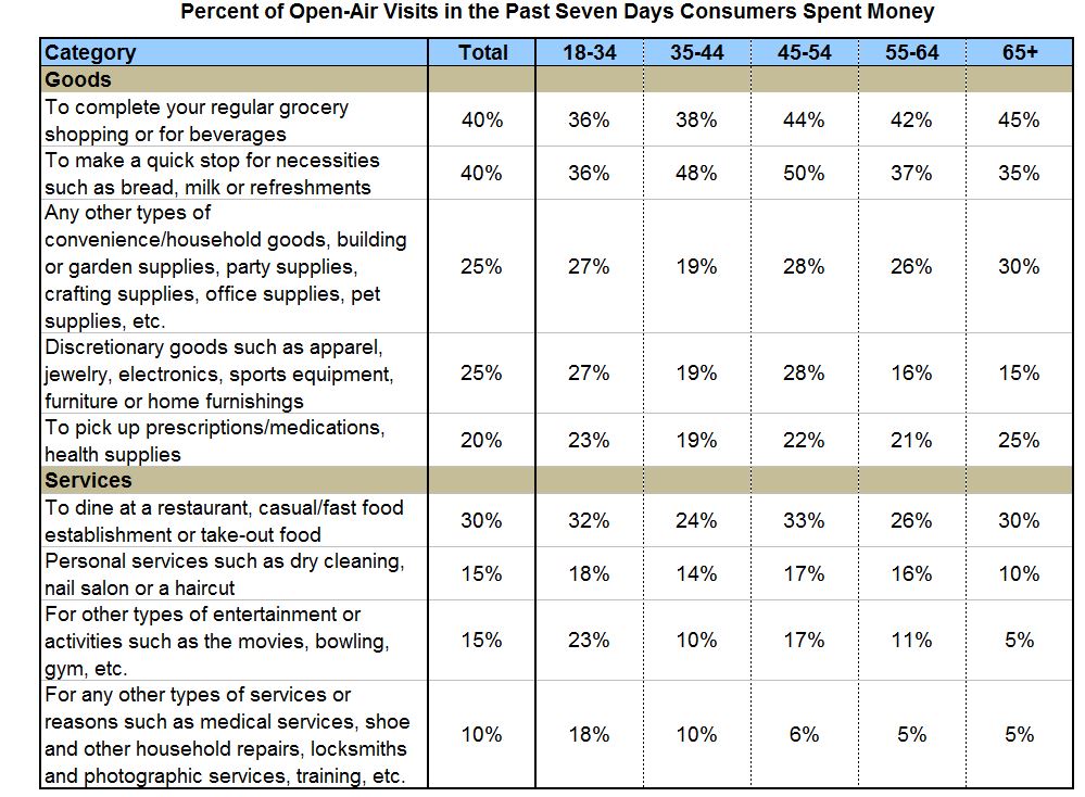 Aside from dining, drinking at restaurants casual/fast-food establishments or bars, consumers purchased goods more frequently than services. Open-air shoppers spent during 40% of their visits on regular grocery shopping. In the same percentage of visits, they also bought necessities such as milk or bread. Discretionary goods, other convenience/household goods, and building/garden supplies were purchased during one-quarter (25%) of open-air visits. One-fifth of the time (20%), shoppers picked up prescriptions/medications and health supplies.