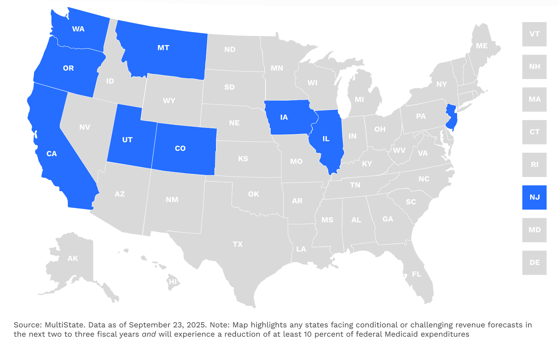 States facing conditional or challenging revenue forecasts in the short term that will be most impacted by federal Medicaid cuts